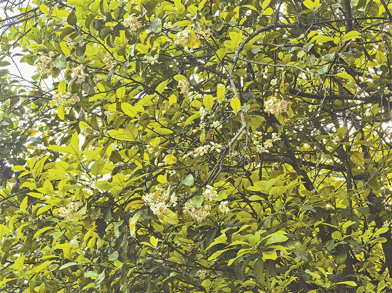 循着一缕清芬抬眼望去,路旁的柚子树依旧低调内敛,深绿的叶隙间,簇拥着点点洁白。那些米粒大小的花朵,羞涩地藏在叶腋下,毫不吝啬地吐露着沁人的幽香。这香气仿佛有灵性,它不似炮仗花那般张扬地垂落如瀑,却能穿透空气,悄然钻入行人的鼻腔,沁入肺腑。走在路上,每一步都像是踏在无形的香毯上,那清芬随着呼吸,一点点洗去心头的尘埃与杂念,只留下满心的澄澈与安宁。