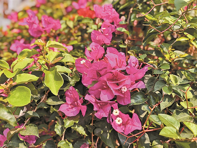 晨光初透,芒市的大街小巷,正上演着一场无声的绚烂。三角梅是这舞台最热烈的主角,它们不拘一格,或攀援在红砖墙头,探出一簇簇紫红与嫣粉,像是要与过路的行人问好;或肆意地垂挂在枝头,织就一道道温柔的花瀑,在微风中轻轻摇曳,仿佛在呢喃着春日的私语。那是一种不服输的生命力——随处扎根,尽情绽放,将整座城市点缀得生机勃勃。