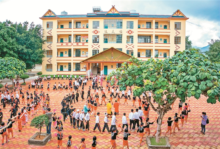 基础教育阶段,“一校一品”的特色创建如火如荼。芒市38所中小学推广“民族课间操”,三台山中学的景颇水鼓舞、中山中学的傈僳族踏歌成为课间标配,12个民族体育项目进入体育课教案。陇川县第二小学的学生们学唱多民族语言歌谣、跳起民族舞蹈,在“团结套餐”的香气中体验文化交融;陇川县民族中学的同学们自发为各族困难同学捐款,用实际行动诠释“中华民族一家亲”。已连续4年举办的全州大中小学课程思政说课比赛,让中华民族共同体意识融入每一堂课;丰富多彩的红色研学活动中,2.1万名学生走进畹町南洋华侨机工回国抗日纪念馆等阵地,聆听各民族同仇敌忾的抗战故事。
