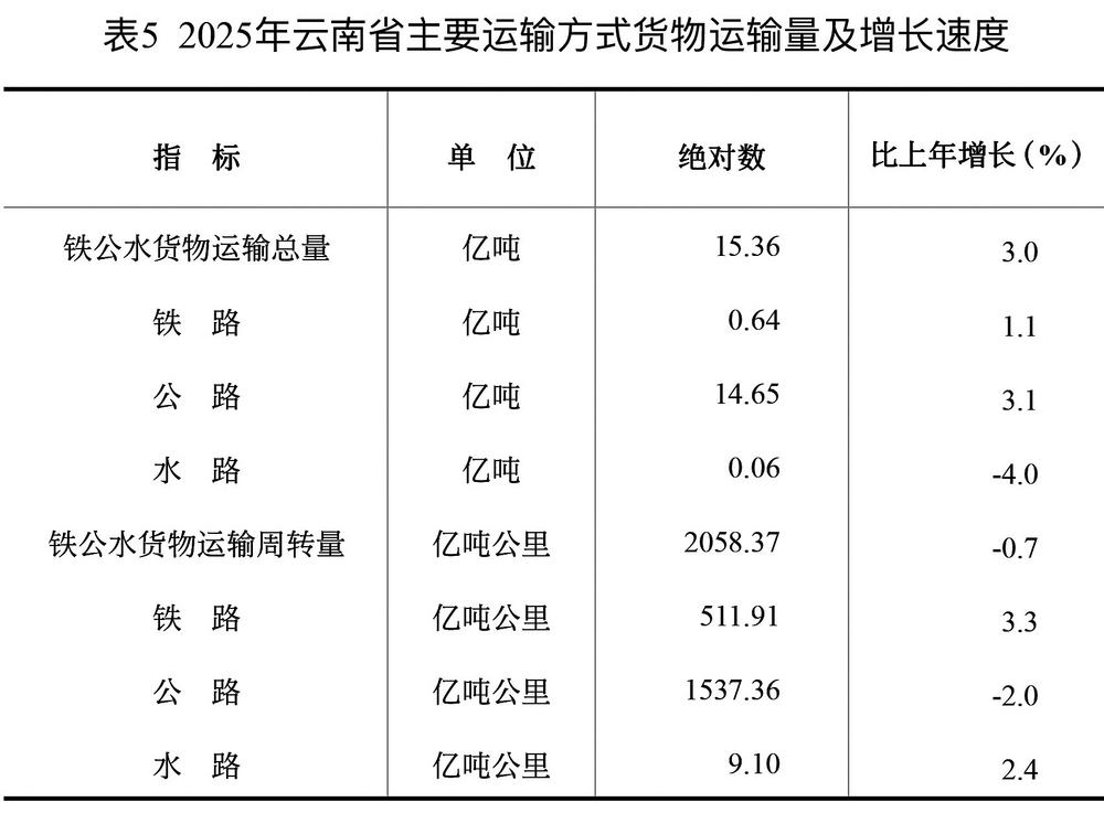 表5 2025年云南省主要运输方式货物运输量及增长速度