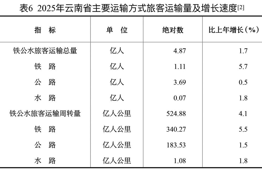 表6 2025年云南省主要运输方式旅客运输量及增长速度[8]