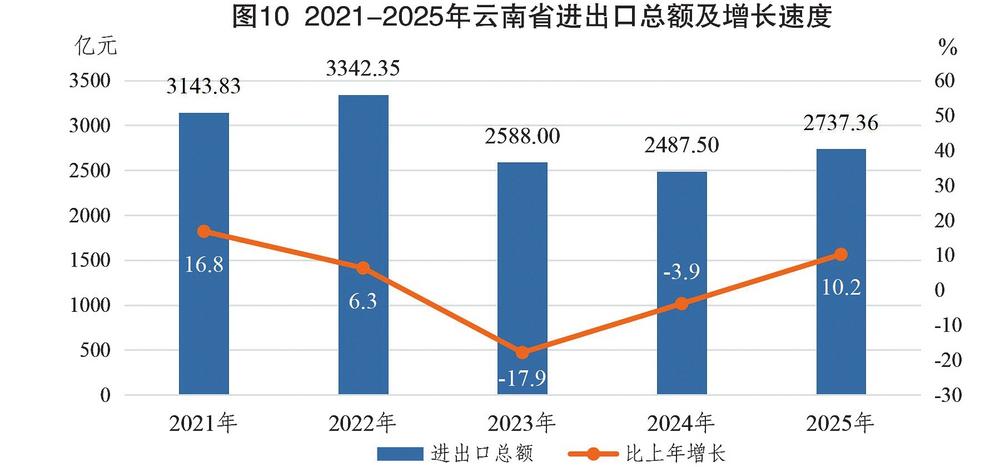 图10 2021—2025年云南省进出口总额及增长速度