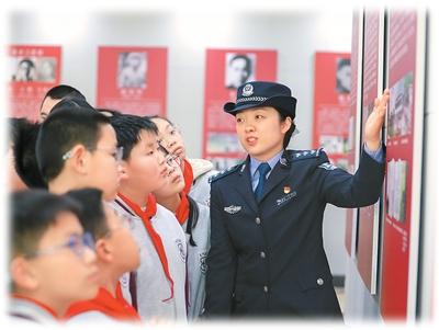 江苏边检总站江阴边检站联合江阴市英桥中心小学开展“清明祭先烈 共铸中华魂”主题活动。图为在革命烈士纪念馆内,民警向学生们讲述革命英烈事迹。程 俊摄(人民图片)