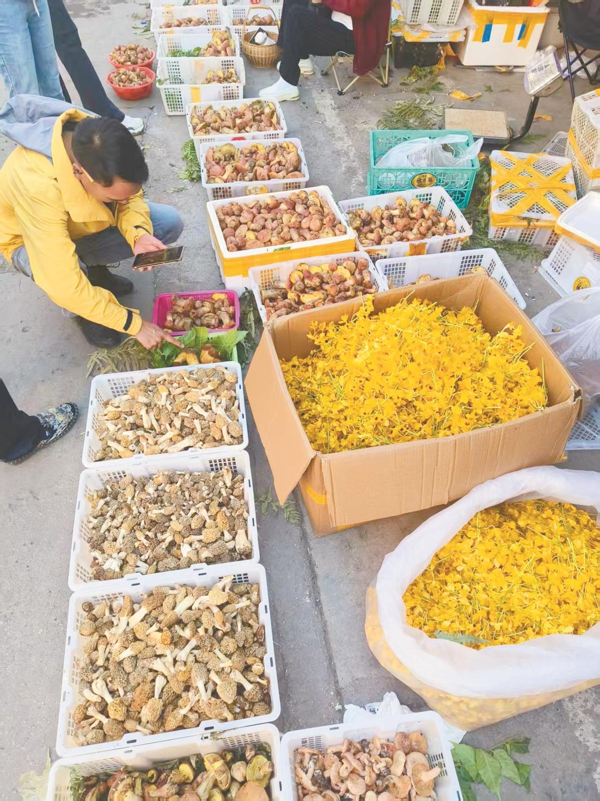 4月7日上午,云南木水花野生菌交易中心十分热闹,近30家商户将新鲜的野生菌整齐摆放在摊位上,吸引市民和游客驻足询价。其中,红葱100元/公斤—600元/公斤,白葱150元/公斤,谷熟菌200元/公斤—300元/公斤,野生羊肚菌220元/公斤—280元/公斤,黑牛肝300元/公斤,黄牛肝800元/公斤。品质相对差的鸡枞600元/公斤—700元/公斤,品相好的则超过2000元/公斤。