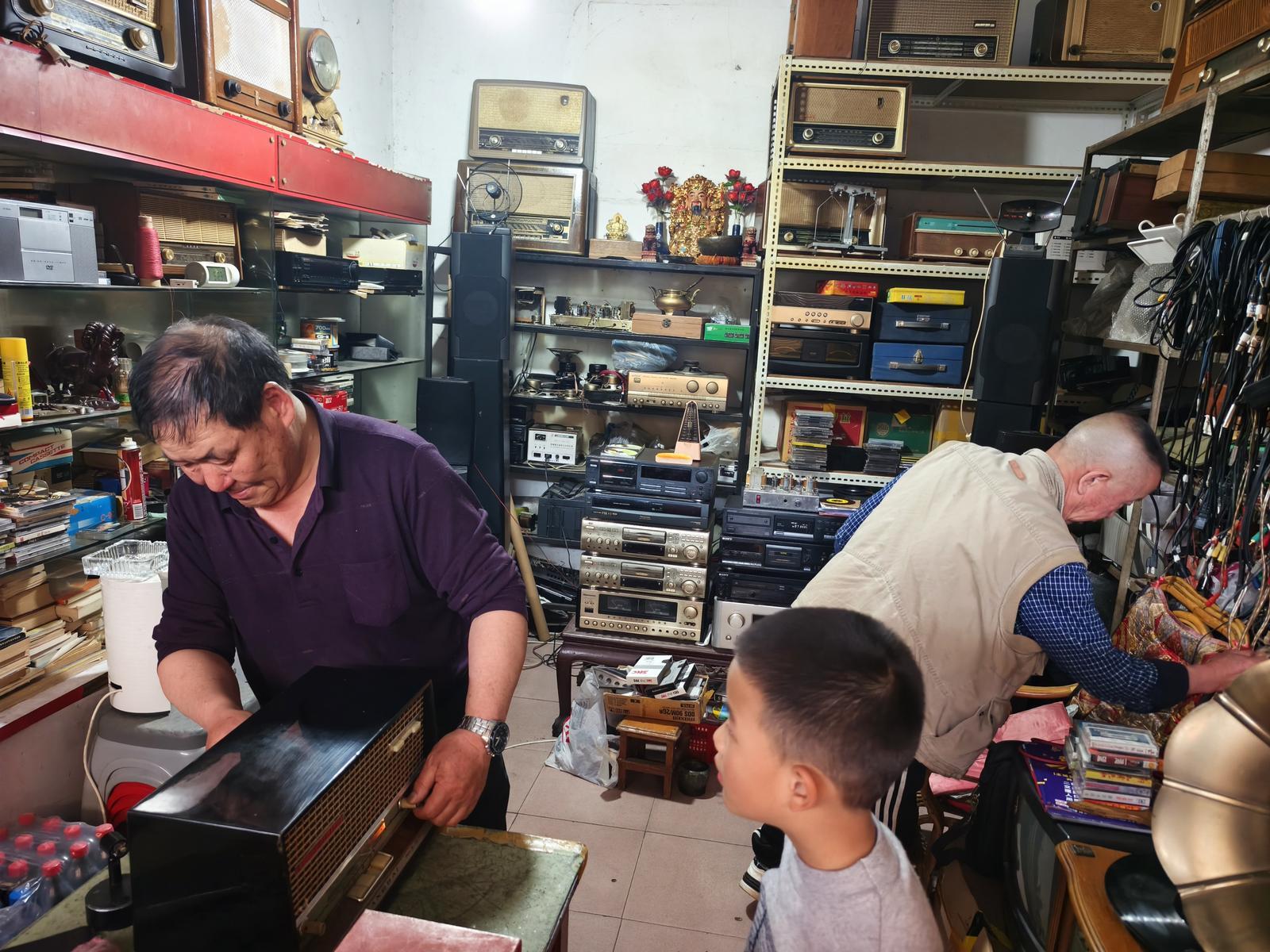 老郭夫妇原是毛纺厂下岗工人,从小屯拆迁后辗转来到潘家湾文化艺术收藏品市场,在此经营已近二十年。两人自学无线电维修技术,让一台台老旧的收音机、电子管音响重新发声。在月薪仅十几元的年代,一台海鸥相机或一台收音机几乎相当于普通工人一年的工资。如今老电器行情回落,少有人问津,但两人依旧守着这些老物件,延续着年代记忆。