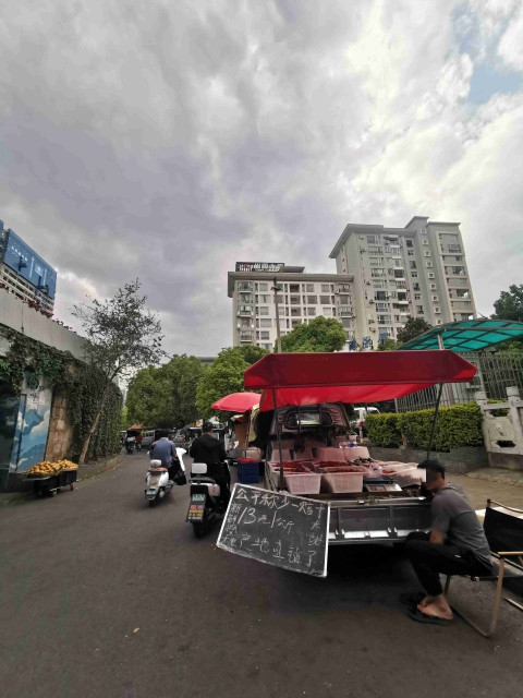 4月8日下午,记者在西苑立交桥下及周边辅道区域看到,大量流动摊贩以面包车、小货车、三轮车为载体,直接占用机动车道、人行便道开展经营,形成连片“马路市场”。桥洞下,货车满载西瓜、菠萝等水果,货品直接堆放在路面,挤占桥洞通行空间;辅道上,有面包车打开后备箱售卖西瓜、枇杷,三轮车摆摊售卖蓝莓等鲜果,红色遮阳伞撑开在车道内,过往电动车、摩托车只能借道绕行,行人与摊位、车辆混行,早晚高峰极易引发拥堵,存在安全隐患。