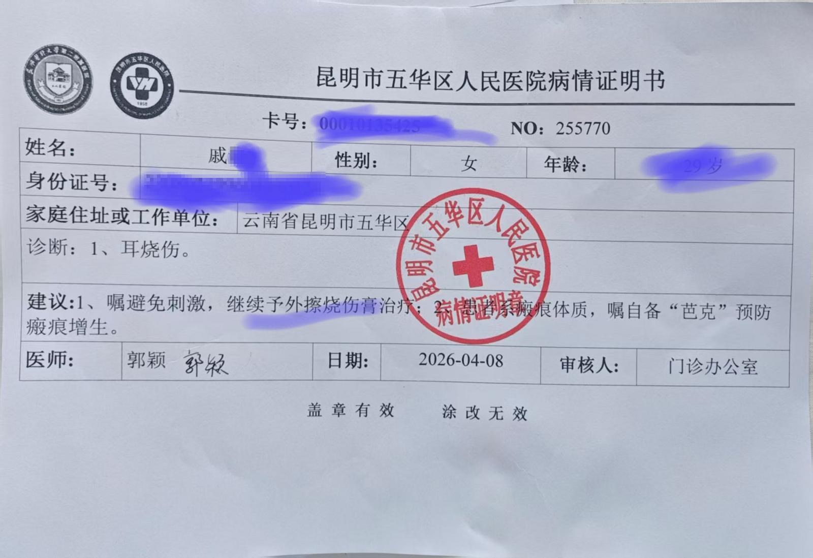 戚女士说:“没想到第二天起床,我就发现被烫伤的地方不仅发红,还起了水泡,又疼又痒,于是自己就花200元买来一支烧伤膏进行涂抹。之后耳朵又疼又痒,很难受,于是我就到昆明市五华区人民医院就诊,医生嘱咐避免刺激,继续外擦烧伤膏治疗。”