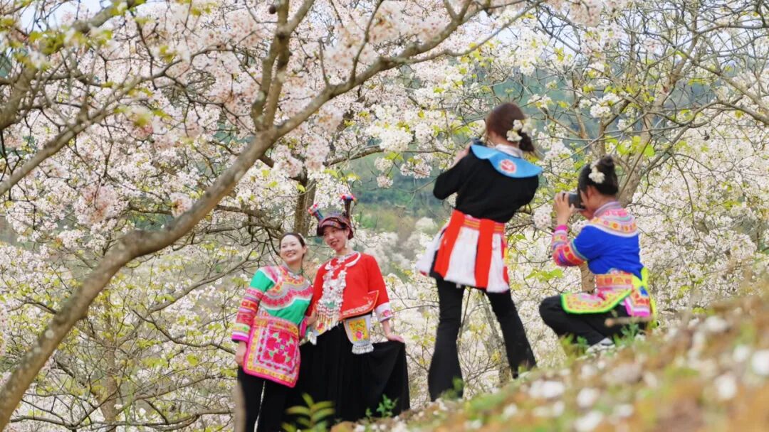 同样在广南县,珠街镇放羊社区长冲村热闹非凡,以“旅居广南·‘梨’不开您”为主题的广南(长冲)第三届梨花节暨辣子鸡烹饪大赛举行。这场集文化、美食、娱乐于一体的特色活动,不仅为周边群众及远方游客提供了出游的好去处,更以花为媒,带动了当地周末游玩经济。活动中,民间表演队身着绚丽的民族服饰,用古朴的鼓声和灵动的舞姿演绎传统舞蹈,为游客带来一场民族文化盛宴。现场还设置了以梨花为主题的美食街区,供游客品尝。同时,主办方围绕村内自然景观与文化特点设计了多个打卡点,吸引了众多游客拍照留念。