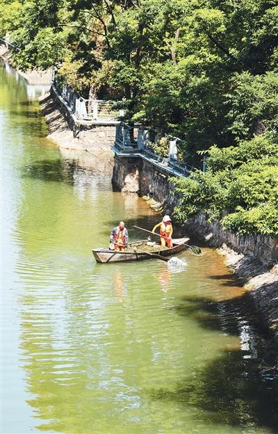 近年来,云南省昆明市政府对35条入滇河道治理工作不断推进,各条入滇河流水质及沿线环境有了明显改善,水生态系统也逐渐恢复,成为不少市民休闲散步的好去处。图为近日,环卫人员正在对大观河水面垃圾进行打捞。(人民图片 郑益/摄)