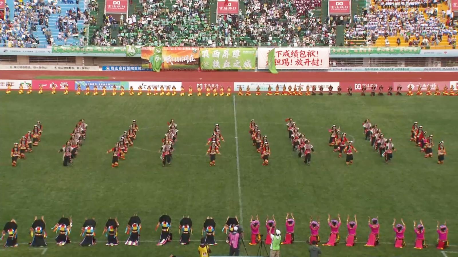 上半场结束,正当球迷们还沉浸在紧张的攻防转换中时,一场浓缩了龙陵文化精髓的视听盛宴精彩上演。悠扬的《最美龙陵》女声小合唱率先响起,如清泉般的歌声为激烈赛事按下了“舒缓键”。歌声刚落,彝族香堂人非遗健身操舞《跳起不怕脚塌皮》随即登场。在唢呐、鼓点和土巴拉乐器的伴奏下,250人按汉、彝、阿昌、傣、傈僳五个民族组成方阵,身着各民族特色盛装,分别从赛场四个入口列队入场,踏着整齐的舞步向赛场中央汇聚。动作刚柔并济,将传统民族舞蹈与活力啦啦操完美融合,展现出龙陵人民热情好客、昂扬向上的精神风貌。方阵最终变换为同心圆,表演者齐声高喊龙陵特色口号,将中场氛围推向高潮。
