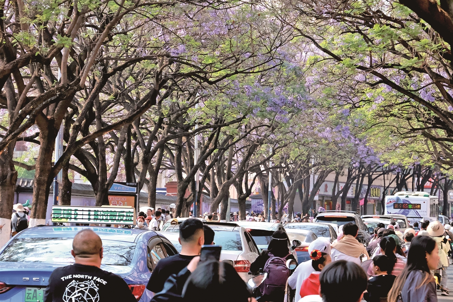 作为昆明最具代表性的蓝花楹观赏地,教场中路每年都会因这场“紫色盛宴”而热闹非凡。记者现场看到,原本沉寂的枝头被紫色花朵密密填满,微风拂过,花枝摇曳,紫雾漫过长街,一步一浪漫。摄影师们穿梭其间,不时指引游客调整姿势,“往左一点,举起手,很漂亮”的指引声此起彼伏,大家争相定格这份春日限定美好。
