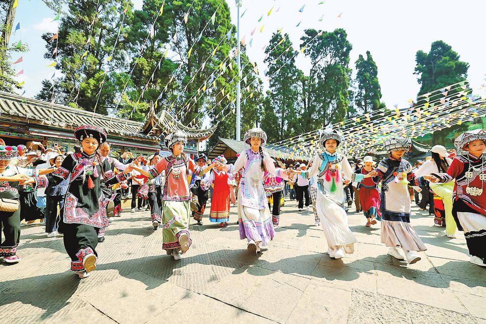 西山景区龙门广场进行民族打歌大联欢。 本报记者 陈飞 摄