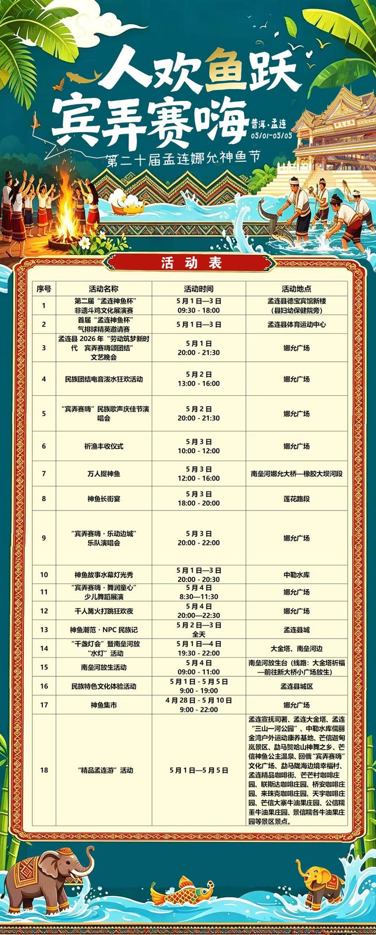 节日期间,活动精彩纷呈,昼夜不停。最令人期待的“万人捉神鱼”将于5月3日中午在南垒河娜允大桥至橡胶大坝河段举行,各族群众与游客挽裤下水、徒手捉鱼,水花与欢笑齐飞,谁若能捕获“神鱼王”,更将获得丰厚嘉奖与全年庇佑的美好寓意。5月1日至3日,非遗斗鸡文化展演赛与气排球精英邀请赛轮番上演,传统民俗与现代体育交相辉映。活动期间,县城的娜允广场更是好戏连台:5月1日孟连县2026年“劳动筑梦新时代 宾弄赛嗨颂团结”文艺晚会,以宣抚司礼仪乐舞和多民族经典歌舞展现边疆非遗魅力;5月2日民族团结电音泼水狂欢与“宾弄赛嗨”民族歌声庆佳节演唱会,将民族风情与潮流音乐激情碰撞,打造热烈奔放、喜庆祥和的狂欢盛宴,用歌声讲述非遗故事、传递“宾弄赛嗨”民族团结情谊;5月3日祈渔丰收仪式、“宾弄赛嗨・乐动边城”乐队演唱会,以古朴民俗致敬自然,唱响“宾弄赛嗨”的团结情谊;5月4日,“宾弄赛嗨・舞润童心”少儿舞蹈展演与千人篝火打跳狂欢夜,将迎来最具孟连特色、最热闹喜庆的文旅狂欢盛宴。5月3日傍晚,莲花路段将摆开神鱼长街宴,百米百桌,神鱼佳肴与傣、拉、佤等民族美食齐聚,烟火气中品味边地风情。此外,千盏灯会、南垒河放水灯、神鱼故事水幕灯光秀、神鱼集市、“神鱼潮范·NPC民族记”等十余项活动贯穿整个假期,让每一位到访者沉浸于孟连独有的热情与浪漫。