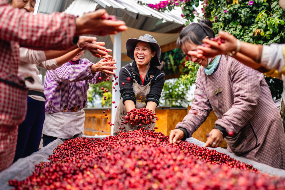 2025年1月8日,在云南省普洱市思茅区天玉咖啡庄园,庄园经营者和工作人员庆祝咖啡丰收。新华社记者胡超 摄