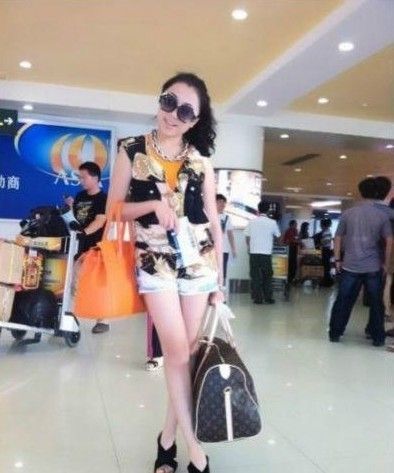 右手挎一个橘红色爱马仕包,左手提一个LV大旅行包。最近这张照片在网上疯传
