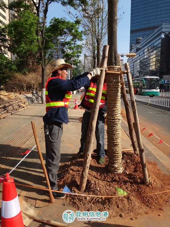 今年年初,受低温寒潮影响,昆明市园林绿化景观受到严重影响,官渡区针对辖区受损植被,科学合理地在年内分步骤推进完成“植绿复绿 增色添彩”工作。当天上午,位于昆明站正前方北京路段的林荫道上,官渡区园林绿化工作人员正在对新更换的云南香樟等苗木进行固定、浇灌。
