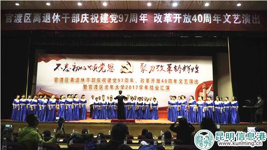 昆明信息港讯 通讯员李伟 杨富洪 又到了一年的毕业季。6月27日,官渡区老年大学2017学年的老年学员也迎来了自己的毕业季。恰逢庆祝建党97周年和纪念改革开放40周年,官渡区老年大学的老年学员们载歌载舞,用一场“不忘初心颂党恩 聚力改革铸辉煌”的演出,歌颂党的恩情和伟大的祖国。