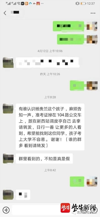 这条消息是:“有谁认识杨贵兰这个孩子 ,麻烦告知一声,准考证掉在镇江市104路公交车上 ,放在新西站调度亭自己去拿。请转发!日行一善,让更多的人看到。希望能找到这位同学,孩子考上大学不容易。谢谢!(谁的群多 看到请转发)”