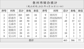 截至4月14日上午11:00,督察组交办群众举报投诉生态环境问题共八批463件(来电386件、来信77件),昆明市203件,曲靖市69件,大理州49件,昭通市34件,红河州20件,楚雄州15件,文山州14件,保山市14件,玉溪市11件,迪庆州10件,西双版纳州7件,丽江市7件,临沧市4件,怒江州2件,普洱市2件,德宏州2件。