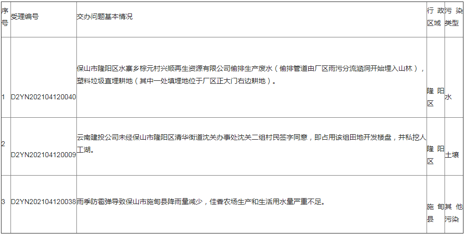 截至4月13日,督察组交办保山市群众举报投诉生态环境问题共4批次11件,涉及3个县区,隆阳区4件、施甸县5件、昌宁县2件。