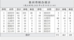 截至4月15日上午11:00,督察组交办群众举报投诉生态环境问题共九批572件(来电463件、来信109件),昆明市261件,曲靖市76件,大理州60件,昭通市42件,红河州21件,楚雄州19件,文山州19件,保山市19件,玉溪市15件,迪庆州10件,丽江市9件,西双版纳州7件,临沧市5件,怒江州3件,普洱市3件,德宏州3件。