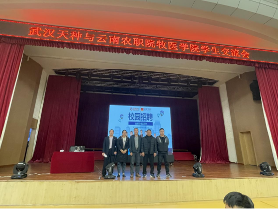 ▲图为武汉天种畜牧有限责任公司领导招聘会前与畜牧兽医学院院长曹国春、招生就业与校企合作办公室主任杨再波合影