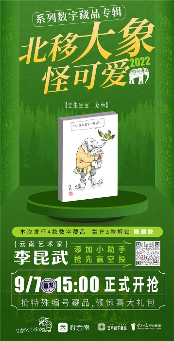 《云南十九怪·北移大象怪可爱》由李昆武执笔,云南日报报业集团、李昆武工作室和“游云南”数藏品牌“云穹”共同推出,是李昆武工作室的首个数字藏品。该数字藏品专辑包括《哈哈,老少出走雨林外!》《OK,喜生宝宝一路带!》《加油!易门过坎凭能耐!”》《爽!直奔翠湖冲凉快》等4款藏品,以幽默诙谐的方式描绘亚洲象“短鼻家族”的北上南归之旅,重温人与大象和谐共处的动人场景。