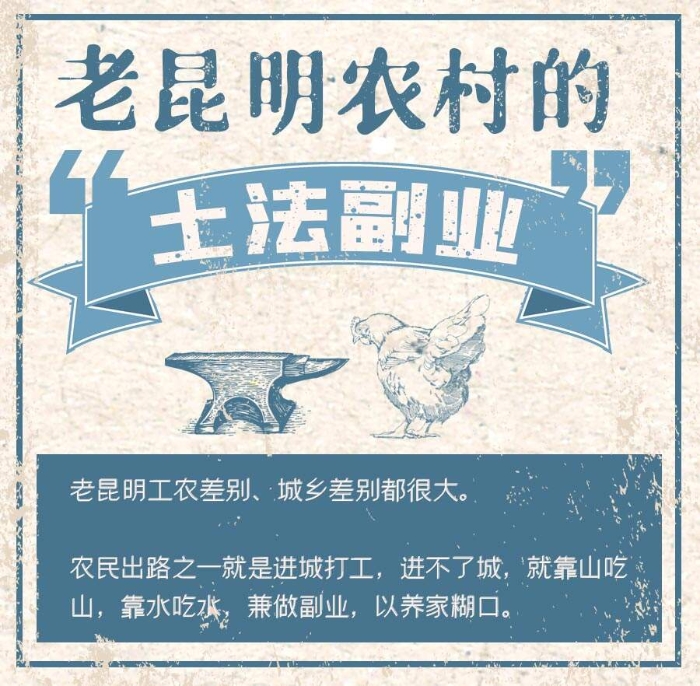 老昆明工农差别、城乡差别都很大。“雇农的工资在省城里每天是二十钱,在农村每日是十钱”(《昆明市志长编》)——相差如此之大,“终年劳苦,不得饱暖”的农民出路之一就是进城打工,进不了城,就靠山吃山,靠水吃水,兼做副业,以养家糊口。