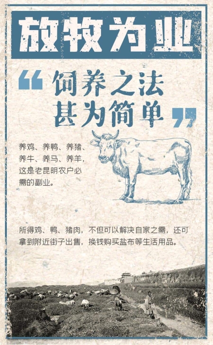 养鸡、养鸭、养猪、养牛、养马、养羊,这是农户必需的副业。所得鸡、鸭、猪肉,不但可以解决自家之需,还可拿到附近街子出售,换钱购买盐布等生活用品。但一般“无大宗饲养之家,至牛马二种,大户者每家亦不过各饲一头,饲养之法,甚为简单,日间则放之郊外食青草,夜间则以畜舍收容之,以稻草为饲料。至秋冬草枯之季,则概饲以稻草,亦间有以杂粮者。其用途马则供搬运之用,牛则供耕田之需”。近城农户有养骡马的,“各畜一二匹或三四匹,每日在南教场、小西门外各地质人乘骑”,“大批骡实不多见,所有驮运数量较多、距离较远之货物,其骡马大半皆雇自外县”(民国《昆明市志》)。