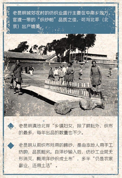 城郊农村的纺织业“盛行于中南乡地方,但不过为农家的一种副业,很少专门经营的。其中又分纱帕业、织布业、制丝业、纺线业几种”。官渡一带“织纱帕的人家很多。这种工业,历来相传,民间自由纺织,没有工厂的设立,品质之佳,可与北平(北京)出产媲美”。后因“女子装饰渐渐改良,这种业务,也渐有退化的趋势”。滇池北岸“乡镇妇女,除了耕耘外,织布的最多,每年出品的数量也不少”,在官渡、小板桥形成了两个土布交易市场。“从前织布所用的棉纱,是由本地人用手工纺的,品质粗劣,不甚适用。自洋纱输入,纺纱工业就无形消灭,概用洋纱织成土布”,多半“仍是农家副业,现在还用土法” (见民国《昆明县乡土教材》等)。