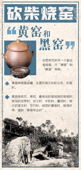 农村另一大副业是烧窑,分“黄窑”和“黑窑”两种。黄窑烧碗盏盆罐,主要在城北的松化坝、瓦窑村。黑窑烧砖瓦、栗炭,比黄窑多一些,最有名的是城南的南窑村、城东的波罗村、尚义村、中和村、瀛洲村,城北的莲花村、范竹村,城西的夏窑村、晖湾村等,堪称“黑窑专业村”。抗日战争以后,昆明人口大增,建筑业兴旺,黑窑又增加不少。