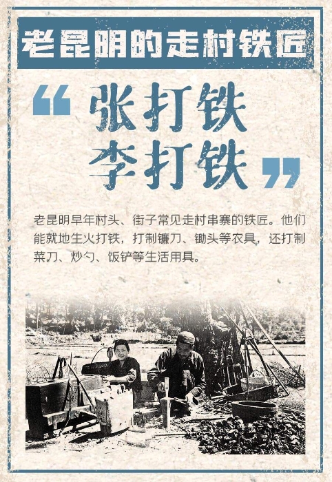 早年村头、街子常见走村串寨的铁匠,他们支起火炉、风箱、铁砧,凭着几杆铁锤,几把夹剪,就地生火打铁,打制镰刀、锄头等农具,还打制菜刀、炒勺、饭铲等生活用具。能干的铁匠,还能打制车轮轴头、轮箍和建筑构件等。打起铁来,风风火火,叮叮当当,引来不少娃娃围观,还走进了娃娃们的儿歌: