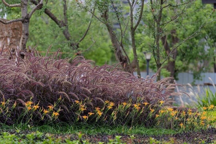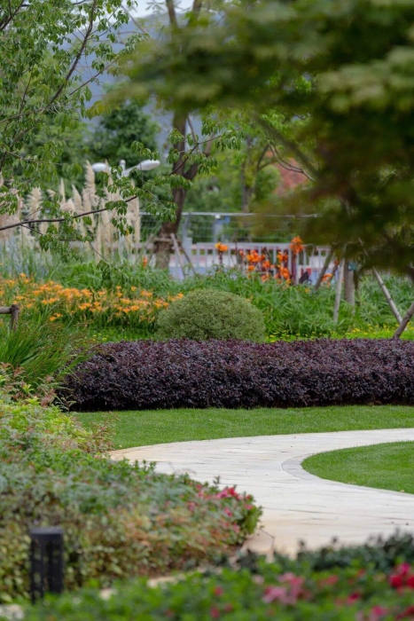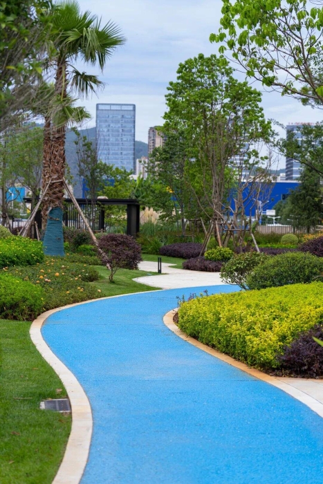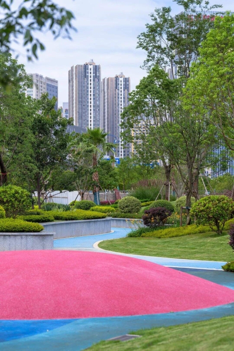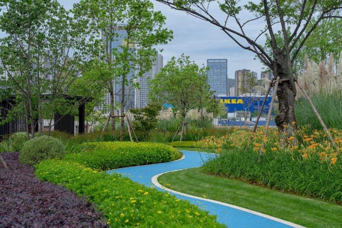 通过植物搭配以及透水铺砖、透水步道、雨水花园等海绵城市设施建设,突出园区的景观效果、文化特色,满足不同人群的使用需求。