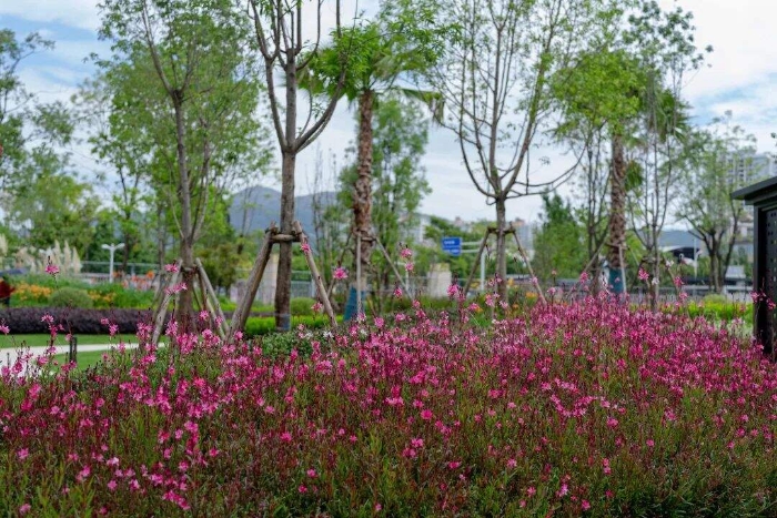 园内主要采用蓝花楹、黄连木、香樟、滇润楠、球花石楠、红枫、头状四照花等乡土树种,通过红花檵木球、金森女贞球、金姬小蜡球等组团灌木以及迷迭香、攀爬月季等特色植物,共计约50多个植物品种进行栽植,以顺势而为的设计、与时俱进的改造,努力营造最美街心花园。