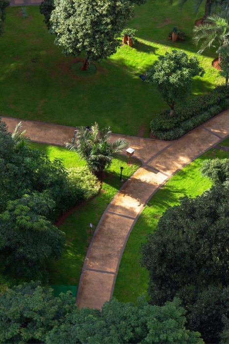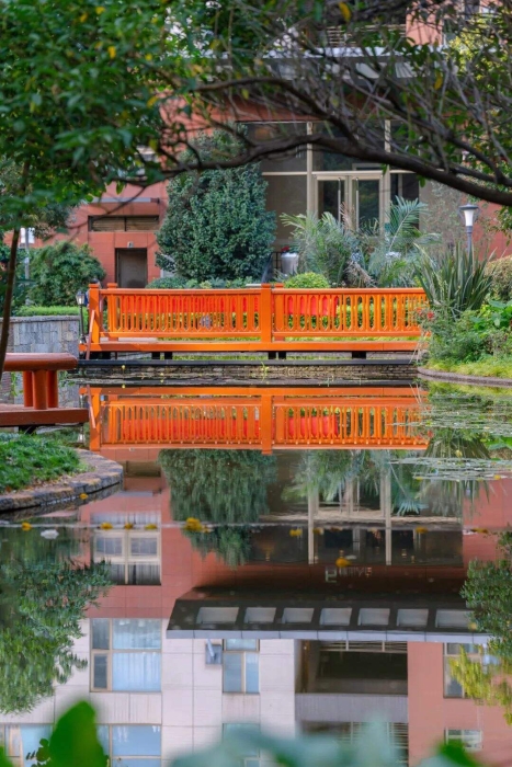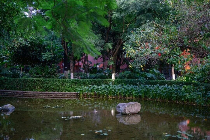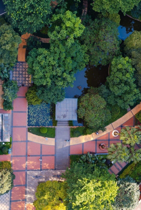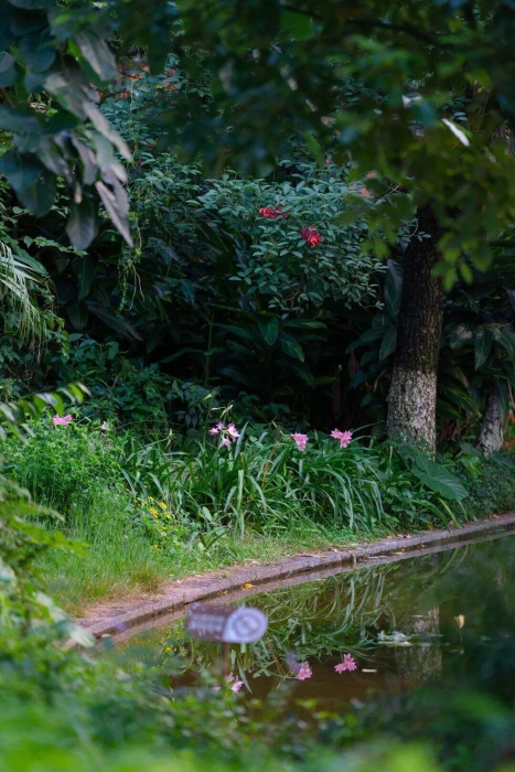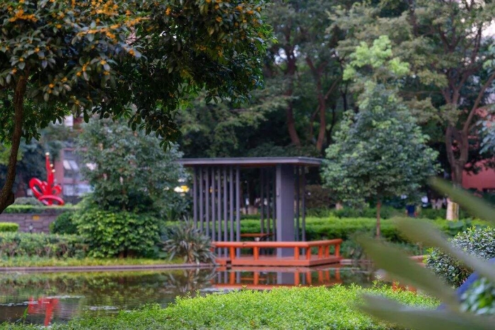 数百种灌木类、竹类、藤本类植物,共同营造出层峦叠翠的视觉效果,使人如入森林深处;4万平方米的中央水景景观,睡莲盛开,锦鲤游弋,为醉人的绿色又添了几分灵动。