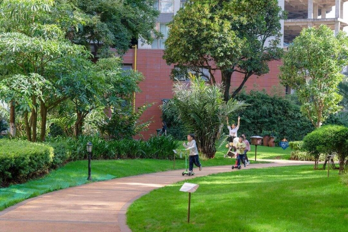 步入七彩俊园,满眼尽是深深浅浅的绿意,滇朴、水杉、青皮木棉、乐昌含笑、蓝花楹、老人葵、鸡冠刺桐等60多种乔木郁郁葱葱,将社区的秋日时光装点得分外丰盈。