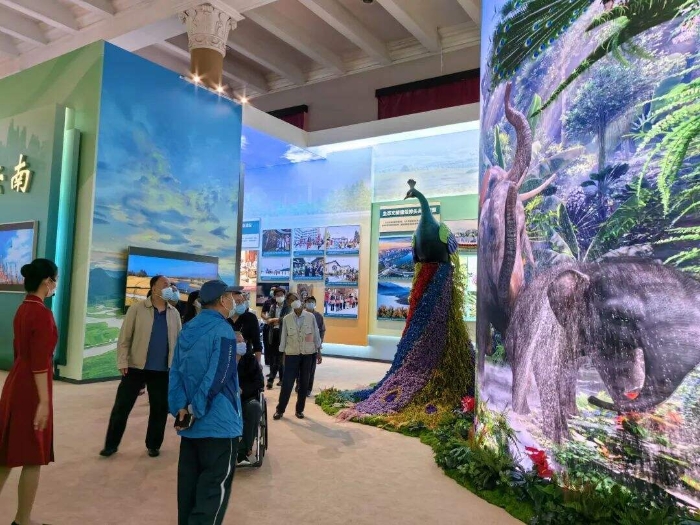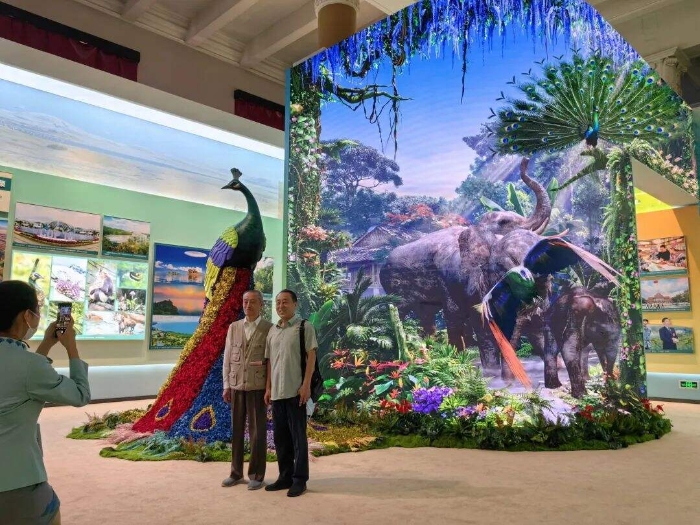 该展项内置云南26个世居民族特色服饰和云南著名景区背景图片,观众可换上民族服装拍照,并扫描二维码下载照片。“哈哈,白族服饰特别适合我,特别清新可爱。”一位观众换上白族女装,与周围的人笑谈起来,其他人也都迫不及待地想尝试。绿孔雀是云南独有的物种,被列为国家一级保护动物,尤为珍贵。而眼前这只头顶直立冠羽,姿态柔美绚丽,栩栩如生的“绿孔雀”,是由勿忘我、蓝星球、红玫瑰、跳舞兰等鲜切花搭建而成的。在它面前,不少参观者都拿着手机拍个不停,也请讲解员来帮忙拍合影。在讲解过程中,展区讲解员回答得最多的一个问题是“这些花是真的吗?”当得到肯定的答案后,来参展的观众都表示既惊喜又向往。