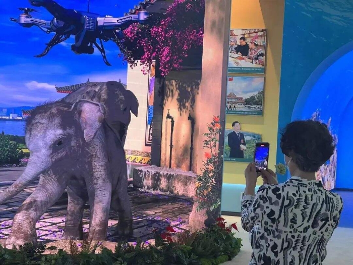 在展厅最显著位置,一面高5米多、宽6米多的弧形多媒体屏幕墙格外引人关注,正在播放裸眼3D视频大象迎宾。该视频以2021年云南亚洲象“北迁南归”为故事主线,生动展现了亚洲象在云南自在生活、人象和谐的场景。随着“太平有象 万象更新”8个大字出现,一群蝴蝶“扑面飞来”,亚洲象一家三口从热带雨林中缓缓“走出”。小象紧跟大象步伐,开启一场奇妙的旅途,途中有舐犊情深的母爱,有蹒跚学步的成长,更有人象和谐的感动。