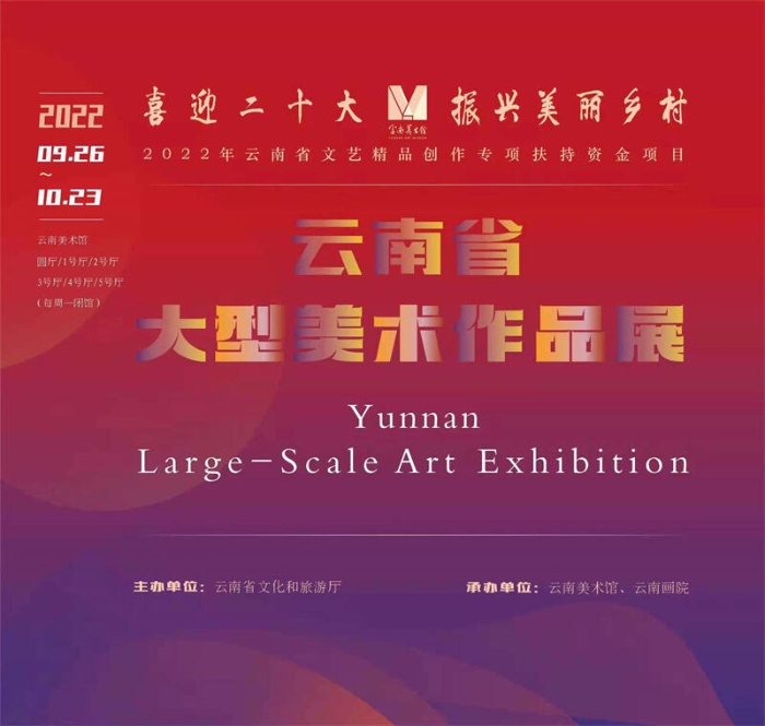 9月26日起,由云南省文化和旅游厅主办,云南美术馆、云南画院承办的“喜迎二十大 振兴美丽乡村——云南省大型美术作品展”在云南美术馆圆厅、1号厅至5号厅内开展,时间截至10月23日。展览以丰富多彩的艺术作品展示十年来云岭大地巨变和乡村振兴发展成效。