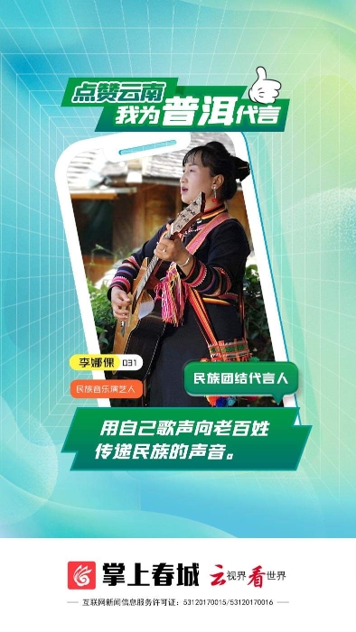 7月22日,2022年云南·昆明网络文化节系列活动“点赞云南 我为家乡代言”手机形象网络征集活动正式启动,面向全省征集典型人物故事,让一个个普通网民成为主角,登上封面为家乡代言,讲云南故事,展云南形象。 活动吸引了市民朋友的广泛关注,自启动以来持续火爆,每天均收到大量投稿,今天登上封面的就是由中共普洱市委网信办推荐“民族团结”代言人李娜倮。