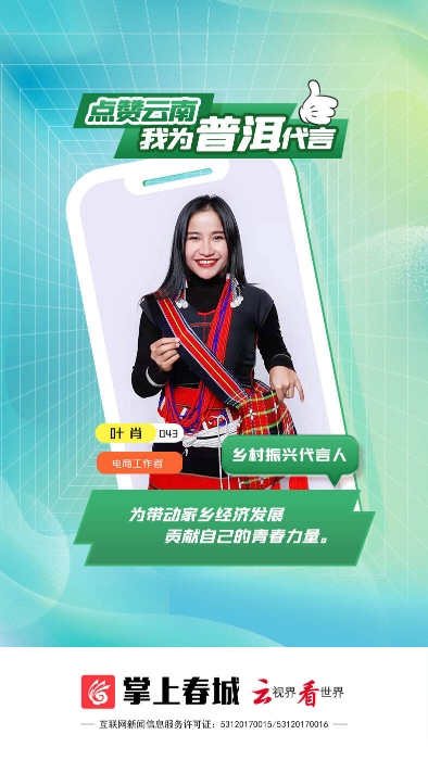 7月22日,2022年云南·昆明网络文化节系列活动“点赞云南 我为家乡代言”手机形象网络征集活动正式启动,面向全省征集典型人物故事,让一个个普通网民成为主角,登上封面为家乡代言,讲云南故事,展云南形象。 活动吸引了市民朋友的广泛关注,自启动以来持续火爆,每天均收到大量投稿,今天登上封面的就是由中共普洱市委网信办推荐的“乡村振兴”代言人叶肖。