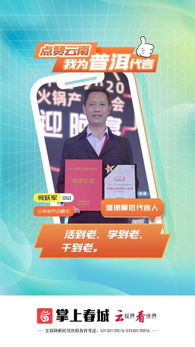 7月22日,2022年云南·昆明网络文化节系列活动“点赞云南 我为家乡代言”手机形象网络征集活动正式启动,面向全省征集典型人物故事,让一个个普通网民成为主角,登上封面为家乡代言,讲云南故事,展云南形象。 活动吸引了市民朋友的广泛关注,自启动以来持续火爆,每天均收到大量投稿,今天登上封面的就是由中共普洱市委网信办推荐的“道德模范”代言人何跃军。