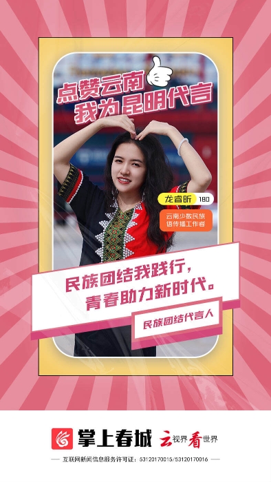 “春城名片”中外闻名、生态建设成果斐然、历史文化底蕴深厚……昆明的美,从不炫耀,这次由你来说!4月28日,“点赞云南·我为昆明代言”主题活动正式开启,活动将寻找2022年最强“代言人”队伍,用自己与昆明的故事,从多元的角度,尽情展示昆明这座网红城市的风情万种。 活动吸引了市民朋友的广泛关注,自启动以来持续火爆,每天均收到大量投稿,今天登上封面的就是“民族团结”代言人龙睿昕。