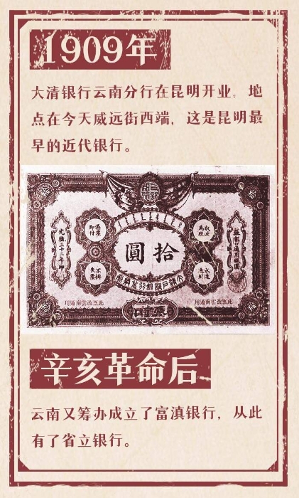 1909年,大清银行云南分行在昆明开业,地点在今天威远街西端,这是昆明最早的近代银行,发行过银两票与银圆票两种“大清地钞”。但不到两年,清朝覆灭,大清银行黯然结束,“大清地钞”被清理收回。辛亥革命后,又筹办成立了富滇银行,云南从此又有了省立银行,在乱世中几起几落,此起彼伏。此后又有“偷渡”入关的外国银行,千方百计操纵汇率,垄断外汇,控制云南的经济命脉,遭到反击后才有所收敛。