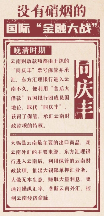 晚清时期,云南财政款项都由王炽的“同庆丰”票号保管并承汇,东方汇理银行进入云南不久,便利用“善后大借款”五国银行团成员国地位,取代“同庆丰”,获得了保管、承汇云南财政款项的特权。蒙自、思茅(今普洱)、腾冲3个海关的税款、云南全省盐课和邮政收益,每年达200万两白银以上,全都收进了东方汇理银行。这些款项陆续收入、定期解缴,其间有个时间差,被法国人用来开展大锡跟单押汇和信贷业务,以“空手套白狼”,逐步操控了云南金融。