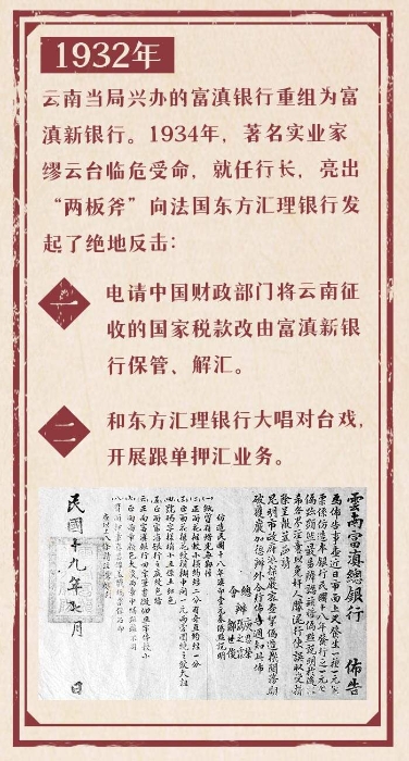 大锡是云南最主要的出口商品,是云南外汇的主要来源。当时蒙自海关出口商品总值占云南全省出口总值的80%以上,而大锡出口又占蒙自海关出口总值的70%至80%,大锡出口事关云南外贸大局。东方汇理银行推出大锡跟单押汇业务,个旧锡商只要把出口单据交给他们,便可得到部分预付货款,由东方汇理银行代货主收取货款,收齐后扣除利息和手续费,再向货主交割其余货款。就这样,他们利用保管的云南财政款项,大做无本生意,赚取大量利息,更通过操纵汇率,垄断云南外汇,控制云南经济命脉。在这种情况下,云南当局兴办的富滇银行被逼到了墙角。再加上其他缺陷和失误,到1932年,富滇银行已到了濒临倒闭的绝境,不得不重组为富滇新银行。1934年,著名实业家缪云台临危受命,就任行长。他谋定而动,亮出“两板斧”,向法国东方汇理银行发起了绝地反击: