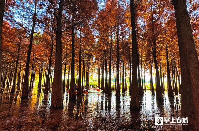 立冬后,昆明海洪湿地公园内由水杉林组成的“水上森林”渐渐变红,轻舟竹筏游走其间,美得好似油画一般,仿佛闯入童话梦境,一不小心就会晃了神。