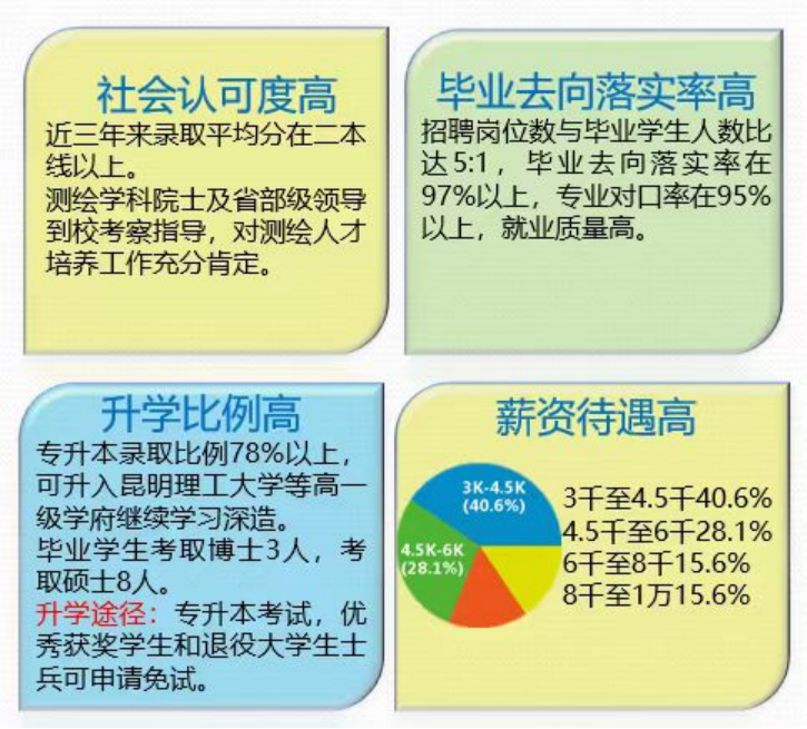 昆明冶金高等专科学校测绘地理信息类专业始办于1955年,至今已有68年的专业办学历史,现有测绘工程技术、测绘地理信息技术、工程测量技术、摄影测量与遥感技术、无人机应用技术5个专业,已形成以测绘工程技术专业为核心的测绘地理信息专业群。在测绘地理信息、遥感、全球卫星导航、无人机摄影测量等技术支撑下,服务于国家基础测绘和国民经济建设各领域。