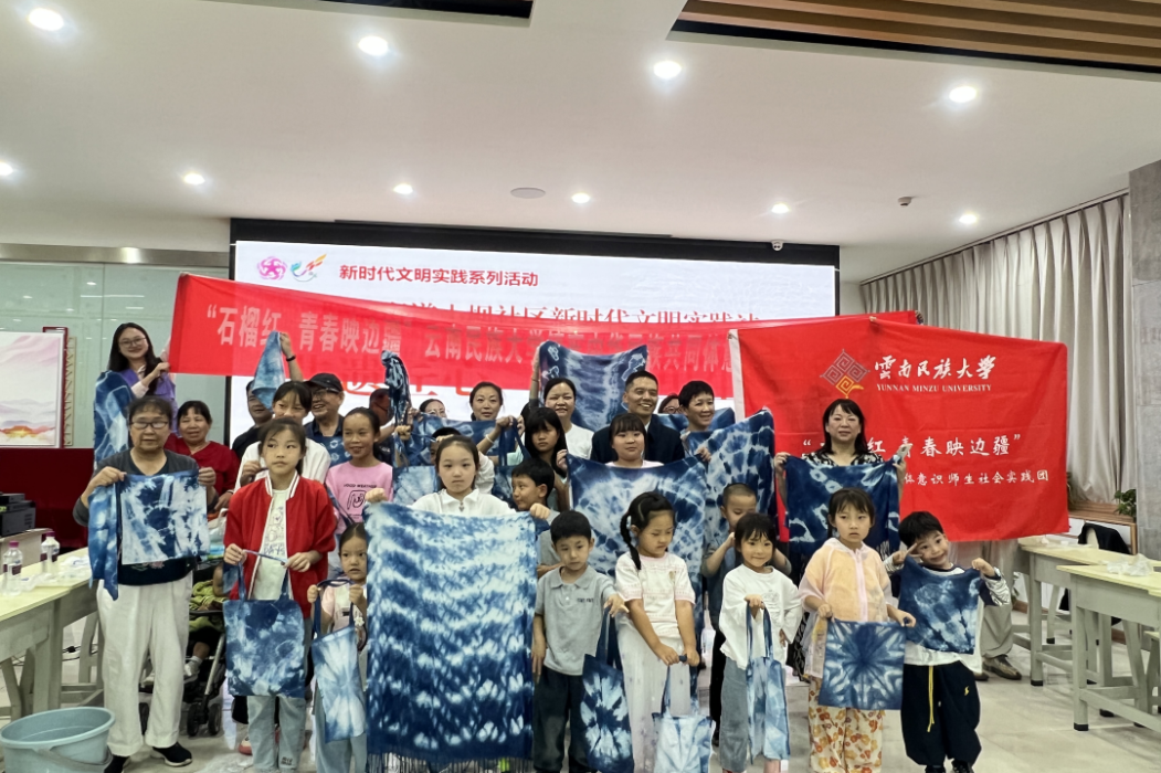 在与云南民族大学“石榴红 青春映边疆”社会实践团联合开展的扎染活动中,孩子们通过绑扎、浸染,创作出独一无二的蓝白画卷,体验“千人千面”的传统智慧,感受各民族共有的生态观与美学理念。