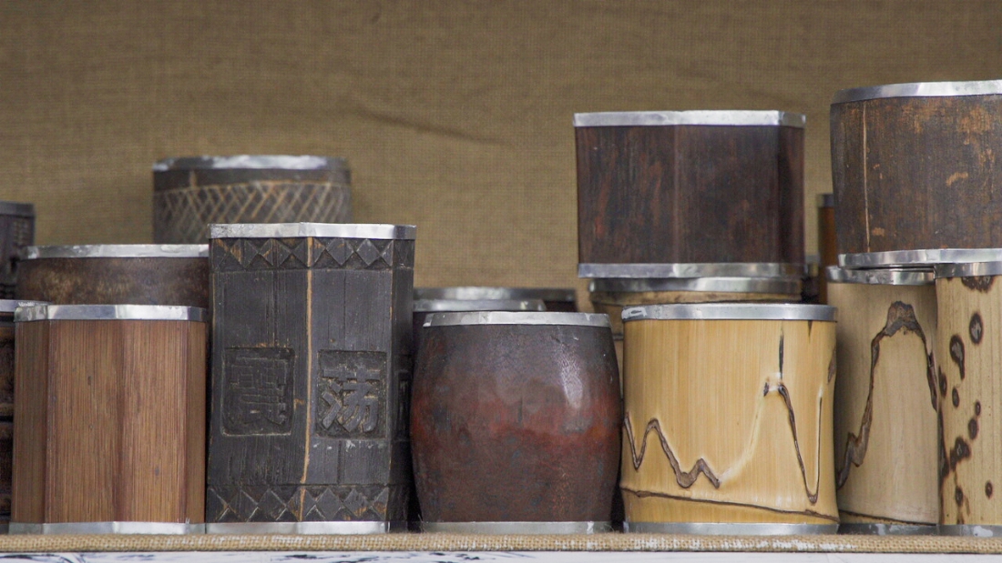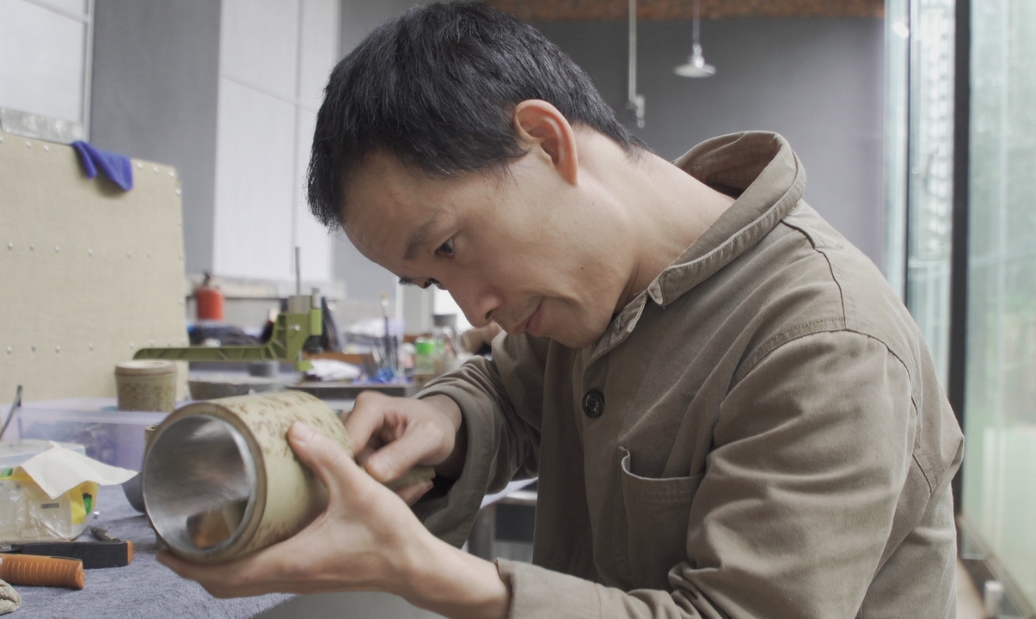 一修介绍,“修竹系列”作品所用的竹子选自云南颇具特色的红湘妃竹,首先通过蒸煮、上蜡、上漆、上保护油来防止竹子开裂,这一系列准备工作之后,开始切割出想要的大小比例,然后在竹子的内部反复打磨,留作备用。